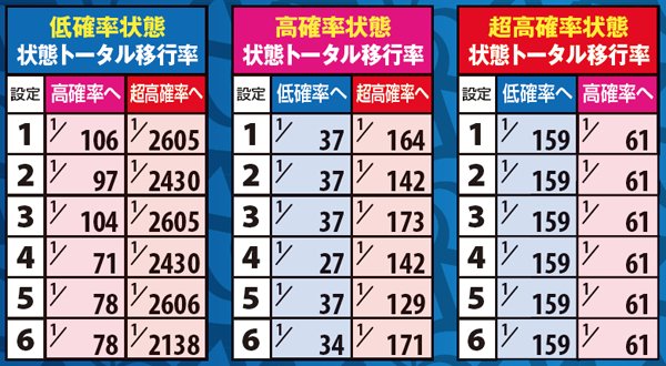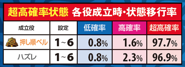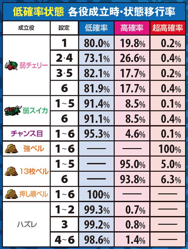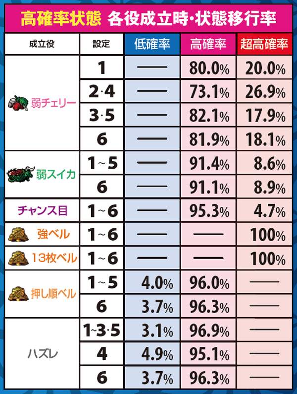 状態昇格契機のメインは弱チェリーや弱スイカ。設定変更時も状態移行抽選が行われ、高設定ほど高確からスタートしやすい。なお、状態転落契機は押し順ベルやハズレ。基本的には一段階ずつ昇格or転落しやすい。
