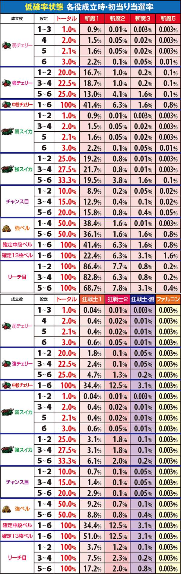 初当り当選率・各役成立時(低確率状態)