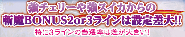 高設定は強チェリーや強スイカから斬魔BONUS発動となった場合、低設定よりも2or3ラインが選ばれやすい。とりわけ3ライン選択割合には大きな設定差があるので、必ずチェックしておこう。ただし、準備中の昇格当選はサンプルから除外。準備中の背景色変化は複数ライン揃いに期待だ。