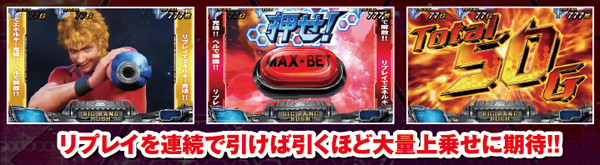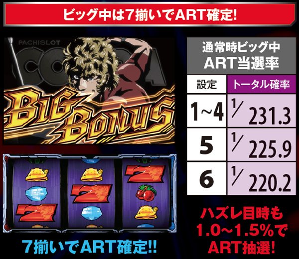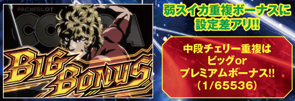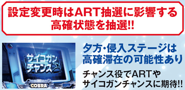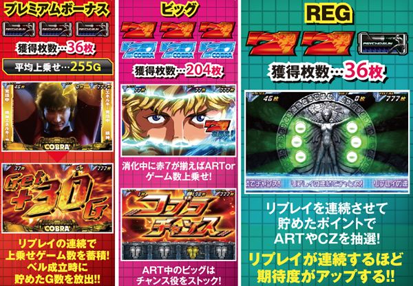 コンセプトはズバリ、溜めて撃って放出。原作の世界観を随所に盛り込んだSNKプレイモアの『パチスロコブラ』は、ボーナスとARTの連鎖で出玉を増やす、オーソドックスなマシン。 主なART突入契機はボーナスとチャンスゾーン・サイコガンチャンスの2種類。 ARTは初期ゲーム数50or315Gで、1Gあたり1.6枚増。消化中はチャンス役成立で様々な抽選が行われる。 |