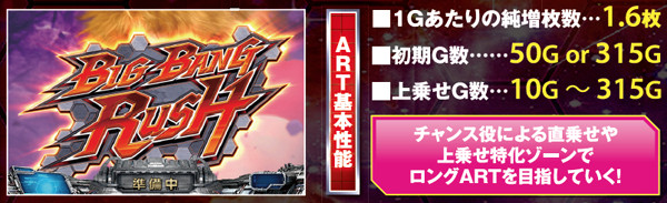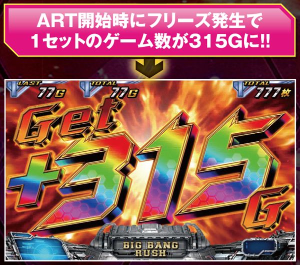 ARTの初期ゲーム数は50or315Gで、ART開始時にフリーズが発生すれば315Gが確定。消化中は随所でゲーム数上乗せに期待でき、直撃上乗せはMAX315Gが見込める。