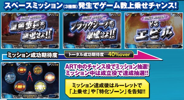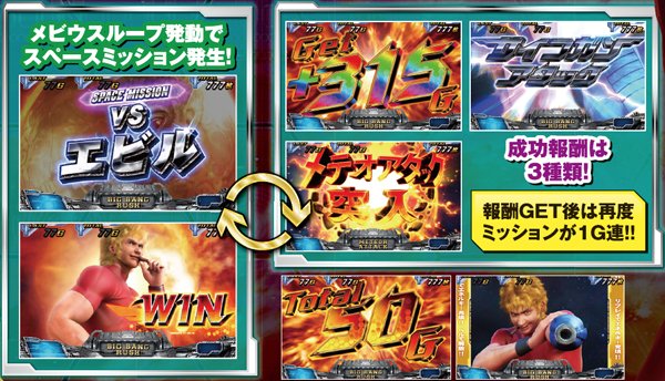 メビウスループへ突入すると、ミッションに失敗するまでスペースミッションが1G連。達成報酬はゲーム数上乗せ・サイコガンアタック・メテオアタックのいずれかとなる。ミッションと達成報酬の連鎖で一気大量上乗せが見込めるというわけだ。
