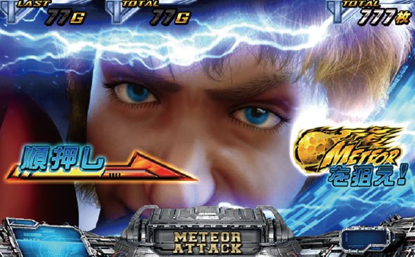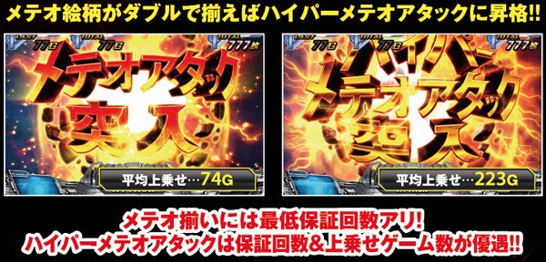 カットイン発生→メテオ絵柄揃いで10G〜100Gを上乗せ。メテオ揃いの保証回数は1〜3回で、保証回数消化後は転落リプレイを回避する限り継続する。