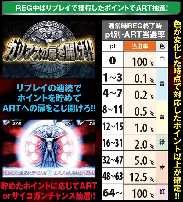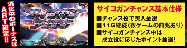 サイコガンチャンスは11G継続で、10G間は成立役に応じてポイントをチャージ。11G目に総ポイント数に応じてART抽選が行われるわけだが、その総ポイント数は液晶両サイドの色で示唆され、緑や赤まで変化すれば大チャンスとなる。