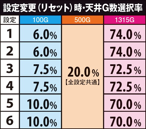 ※天井ゲーム数100・500Gが選択されても、ボーナス間1315Gの天井は有効となる