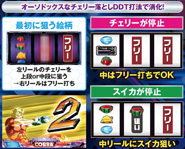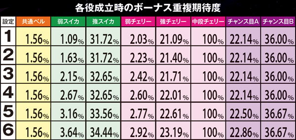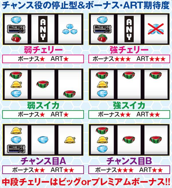 チャンス役を見抜くための小役狙い打法は、オーソドックスなチェリー落とし手順がオススメ。ちなみに、チャンス役の中で期待度が高いのは強チェリーとチャンス目Bだ。弱チェリーと弱スイカは高確移行契機としての役割が強い。