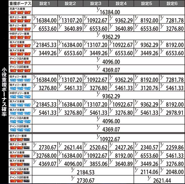 本機のボーナスは必ずチャンス役と同時当選する仕組み。ボーナスが単独成立することはなく、重複期待度は共通ベル<弱スイカ<弱チェリー<強チェリー<チャンス目A<強スイカ<チャンス目B<中段チェリーの順に高くなっている。なお、プレミアムボーナスは中段チェリーとのみ重複成立し、その消化中はスーパーサイコガンアタックが発生する。