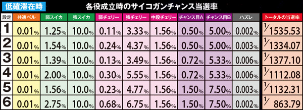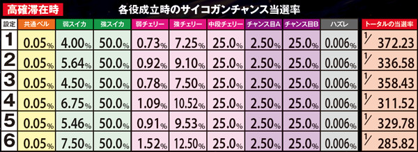 サイコガンチャンス当選率は偶数設定の方が優遇されており、当選時には最大16Gの前兆を経由して発動する。