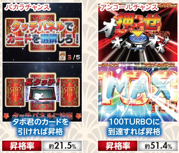 偶数揃いの大当りで発生。アンコールチャンスの方が期待できる。カードの枚数や開始時の数値に注目だ。