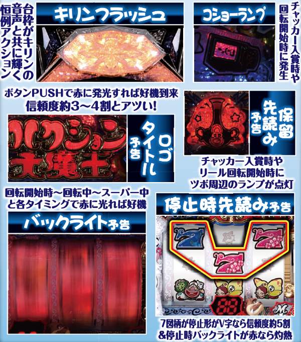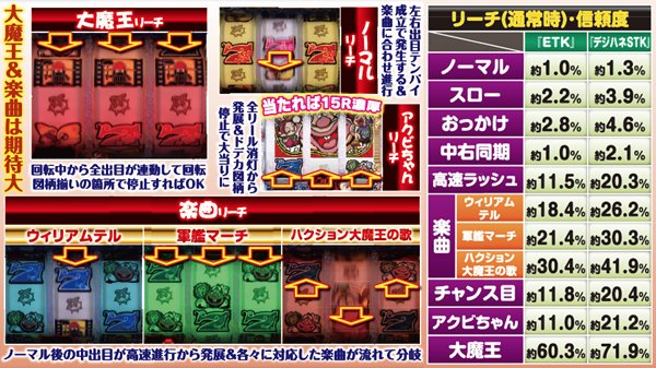 本機における初当り発生時のリーチはノーマルが4分の1を占めるが、信頼度は低いため過度な期待は禁物。主軸は多彩なスーパーリーチとなり、なかでも3種類ある楽曲や、プレミアム以外では最強の信頼度を誇る大魔王の発生がカギとなる。