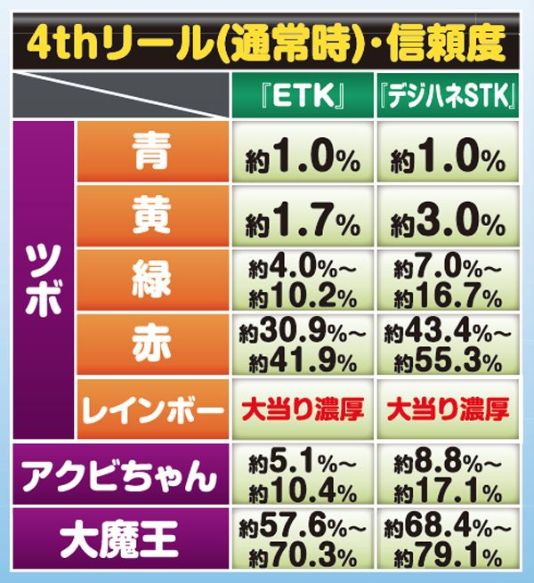 4thリールは保留先読み予告で作動するほか、図柄や発生箇所により期待度が変化。ツボ赤ならドラムの左リール停止時、アクビちゃん&大魔王なら右リール停止時の発生でさらに期待度が上昇する。
