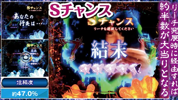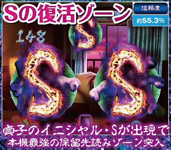 S図柄が3つ揃うと発生。本機最強の先読みゾーンで、ストーリー系リーチの発展も約束される激アツのアクションだ。