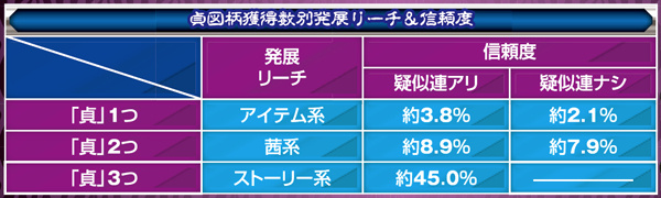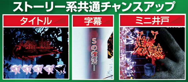 図柄揃いの軸となるストーリー系リーチは5種類。発展した時点で激アツの「結末」以外はミニ井戸から飛び出る文字で信頼度が変化し、熱以上なら期待度が飛躍的に上昇する。