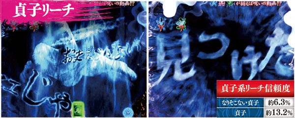 図柄停止時やリーチ後に集まる貞図柄は、初当りの鍵を握る重要演出。その数に応じてリーチが変化し、3つ揃えば激アツだ。