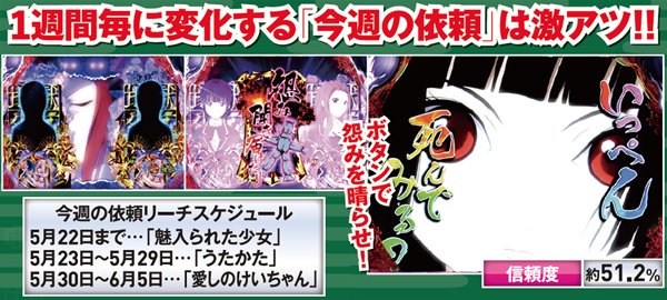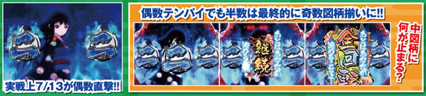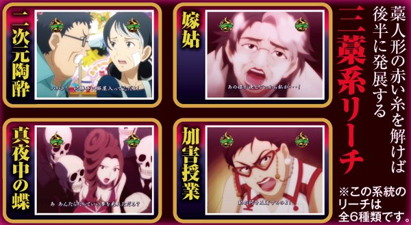 中出目に藁人形図柄が停止すれば本リーチへ発展し、約半数が大当りにつながる信頼度を誇る。また、リーチの種類が1週間毎に変わるので、その内容にも注目しよう。