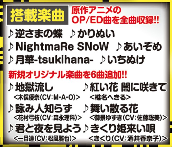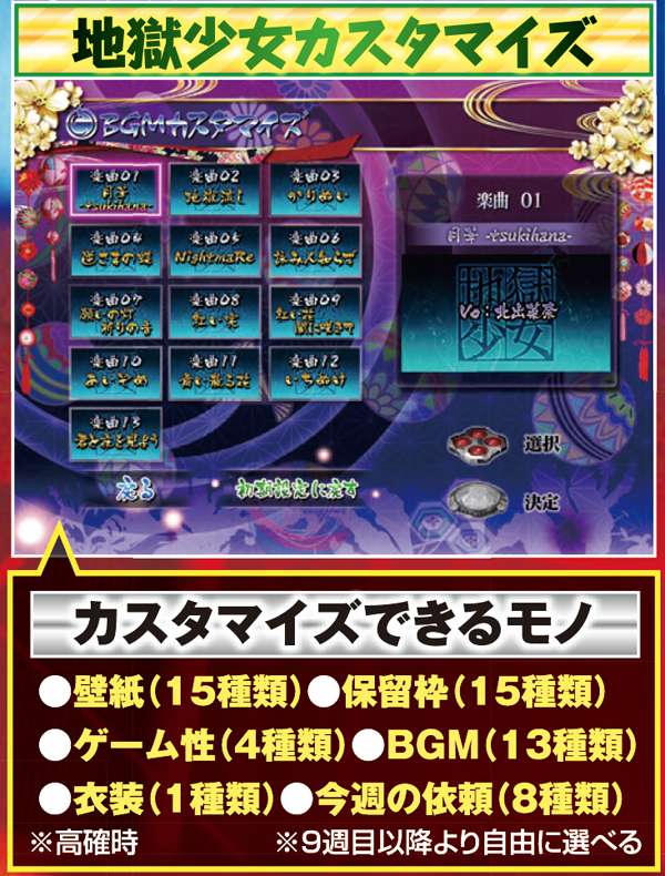 地獄少女カスタマイズはデモ画面中にボタンを押すだけで選択が可能。自分好みのBGMや壁紙に変更すれば、より楽しめること間違いナシ。また楽曲が大量に追加されたのも、ファンには嬉しい計らいだ。