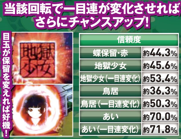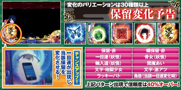 初当りの起点となる保留変化は、基本の色系だけでなく、消化中に変化するアイコンの種類にも注目しよう。三藁の姿が妖怪ver.だったり、「地獄少女」の文字が表示されれば信頼度40%OVERだ。
