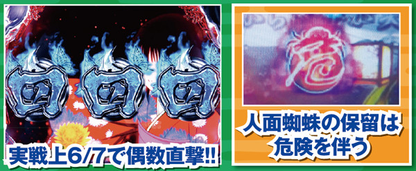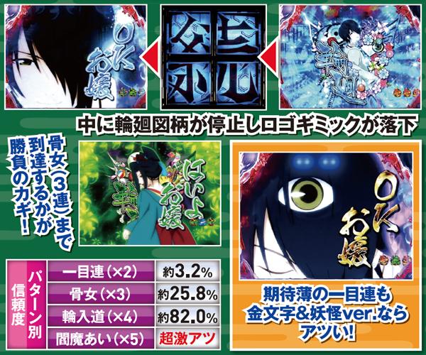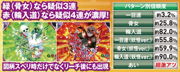 疑似連発生時は中出目のキャラに注目。出現するキャラによって疑似連回数が示唆されており、骨女なら3連、輪入道なら4連が濃厚。