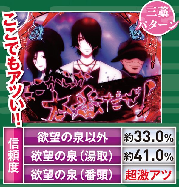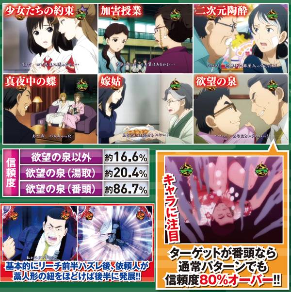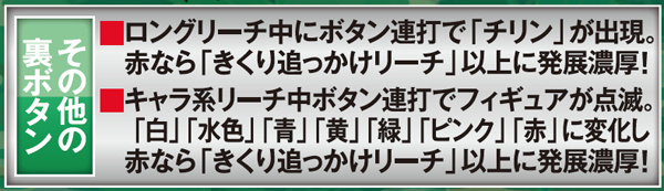 リーチ中に、ロゴギミックに「続」の文字が形成されれば発展。全6種類ある中で「欲望の泉」だけ突出してアツくなっており、キャラ次第では鉄板となる。