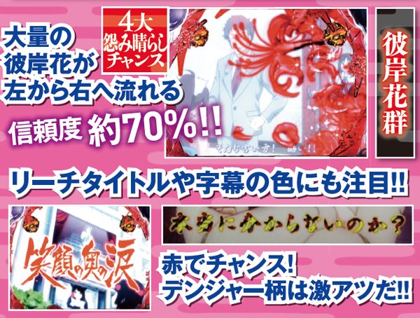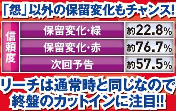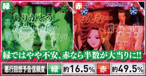 後半発展時にセリフの色が変われば好機。また、悪行回想予告は赤が出現すれば信頼度大幅アップだ。
