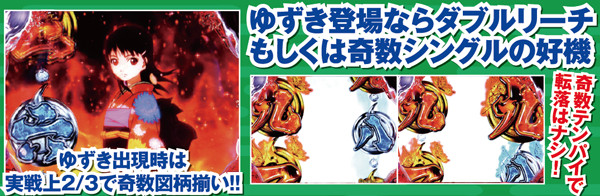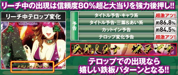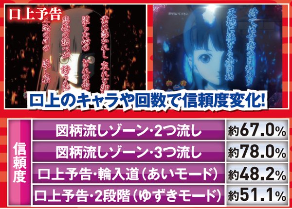 口上予告は、あいやゆずきが登場する最終形までいくかどうかが重要となる。図柄流しゾーンでは流した図柄の数に注目で、3つなら確変継続期待度が70%超を誇る。