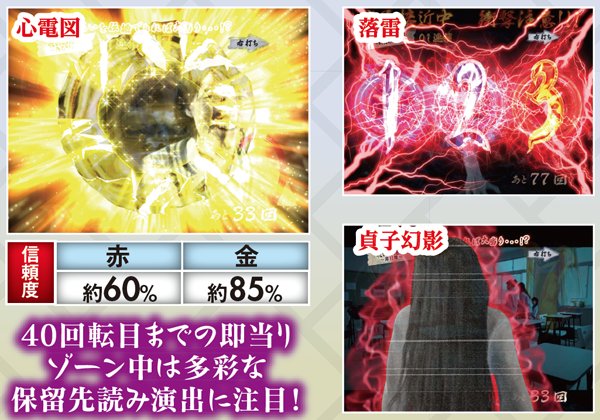 人々を恐怖へ導いた『CRリング運命の日』が、羽根デジタイプで再臨。 通常時からST中まで、秀逸な演出はそのままに、呪いの刻はより近づく…。 |