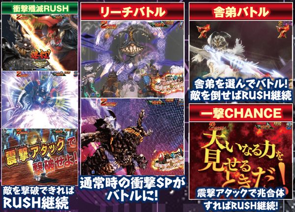 確変継続は大当り中のバトルで決まる。バトルは4種類存在し、衝撃殲滅RUSHは基本的にバトルで敵を倒せば継続。舎弟バトルは、選択した舎弟が勝てば継続となる。一撃CHANCEは兆合体すれば継続だ。