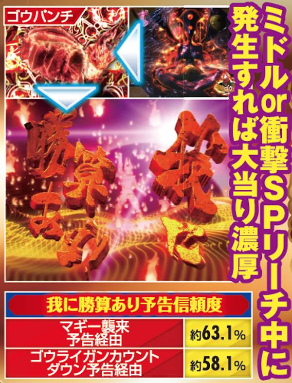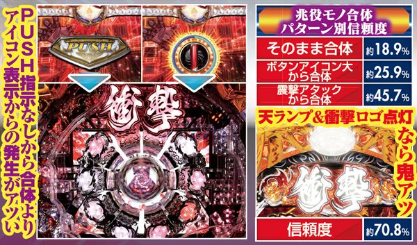 衝撃SPリーチの中でも「真界皇リーチ」が最も大当りに期待でき、役モノが完成する「兆合体」を伴えば更に信頼度がアップするぞ。