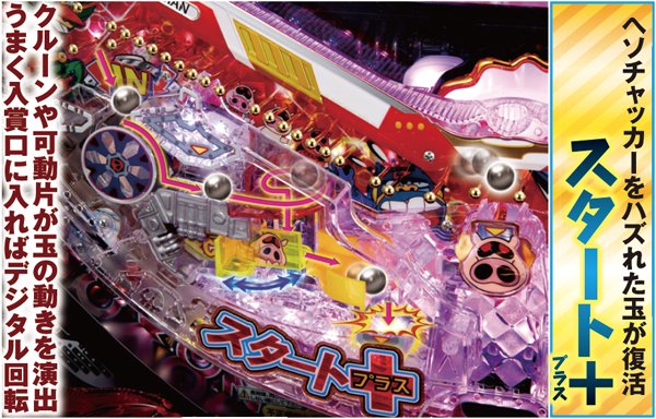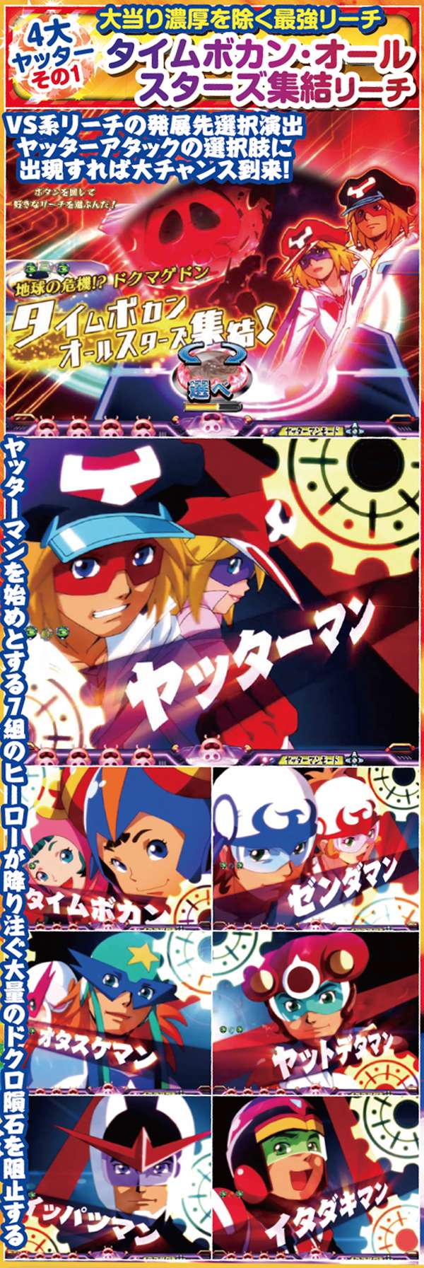 | 機種概要 | 表題こそ『CRヤッターマン』ながら、タイムボカンシリーズの歴代ヒーローが本機のために大集結! 通常時および確変中と、様々な場面でチャンスを告げる存在として登場する。とくに、ヒーロー全員が勢揃いするタイムボカン・オールスターズ集結リーチに発展すれば大チャンス! |