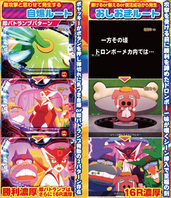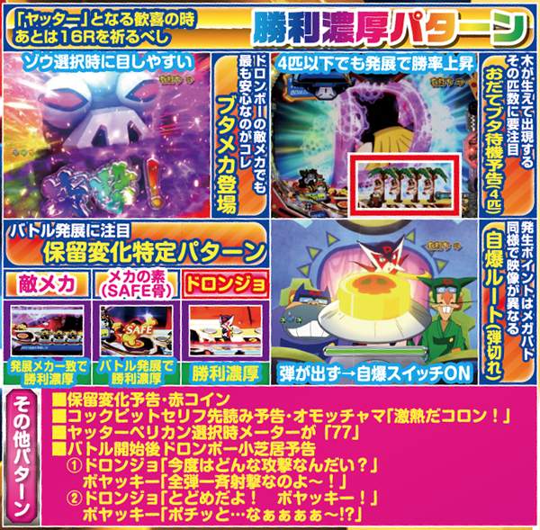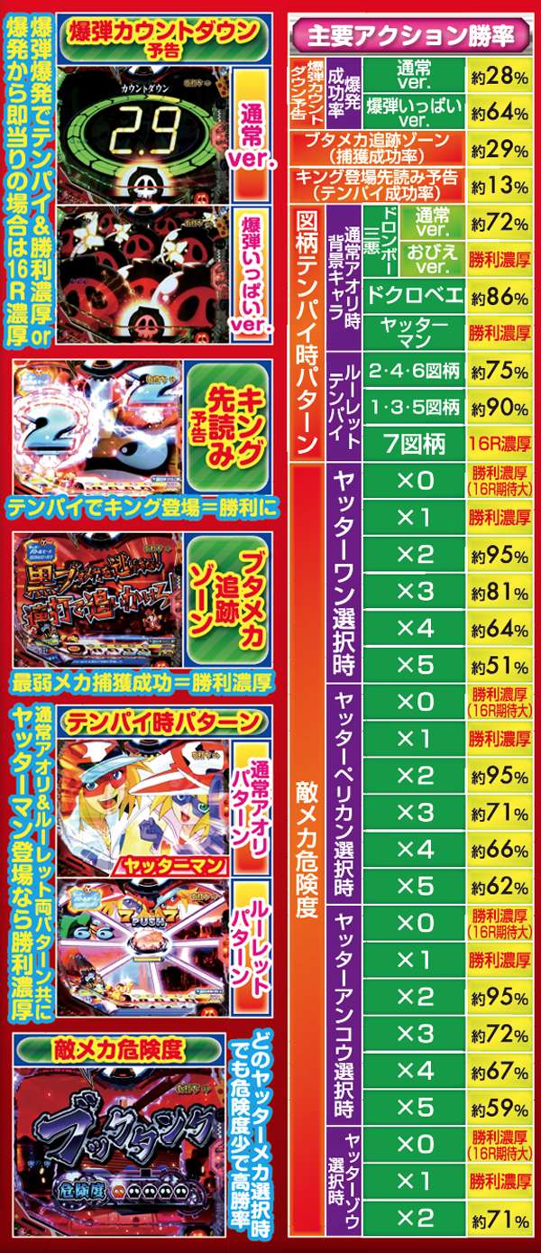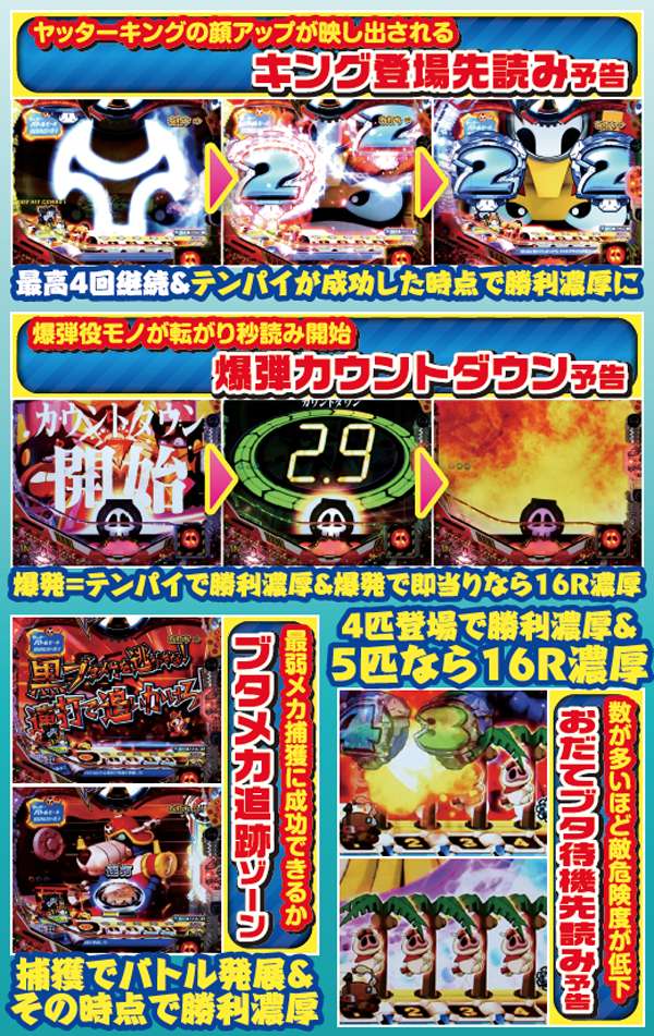 「キング登場先読み」、「爆弾カウントダウン」、「ブタメカ追跡ゾーン」の3つはテンパイ成立の時点で勝利濃厚。さらに、後の展開次第ではバトル以前に16Rまで確定する嬉しい演出だ。
