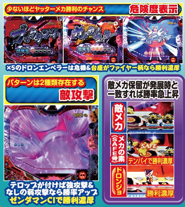 敵メカ登場時に表示される危険度は少ないほど良い。敵メカの攻撃は2種類存在し、テロップ付きの強攻撃でピンチ、テロップなしの弱攻撃でチャンスとなっている。