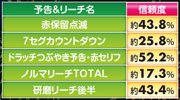 ノルマリーチはトータルでの信頼度となっており、ノルマの数が少ないほどチャンス。また、研磨リーチは掛け声の種類で信頼度が異なるようで、激アツパターンの存在も!?
