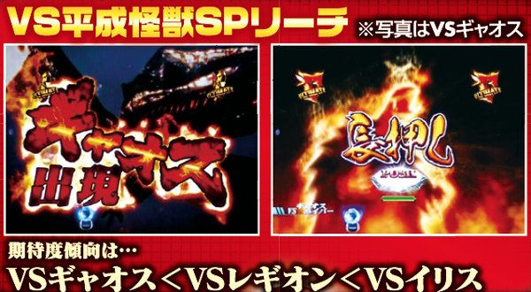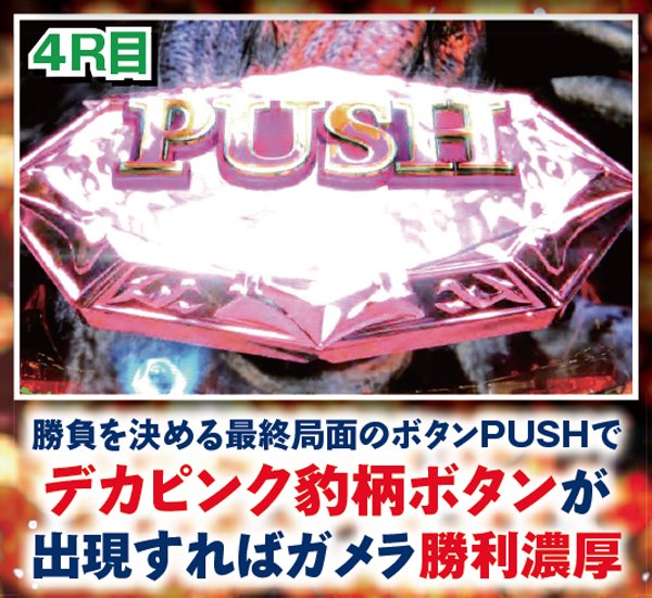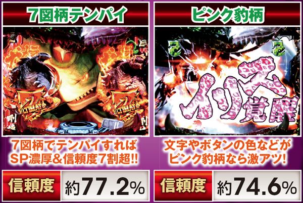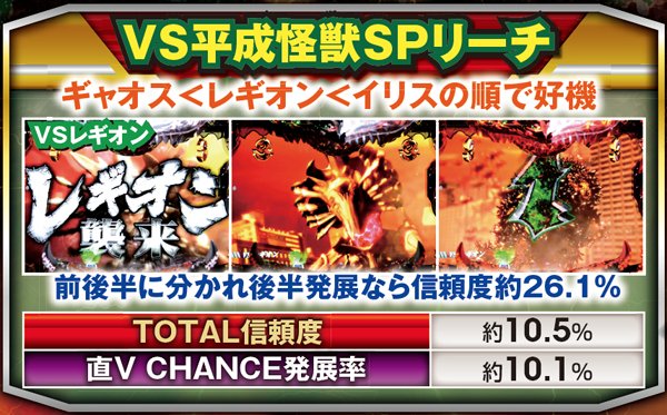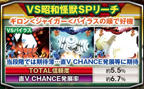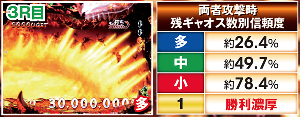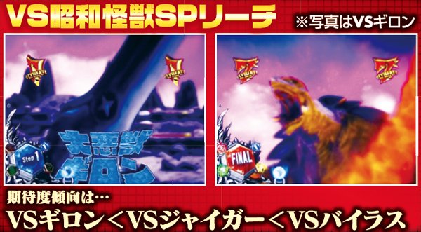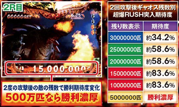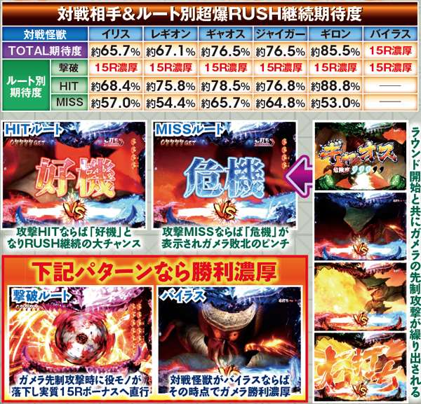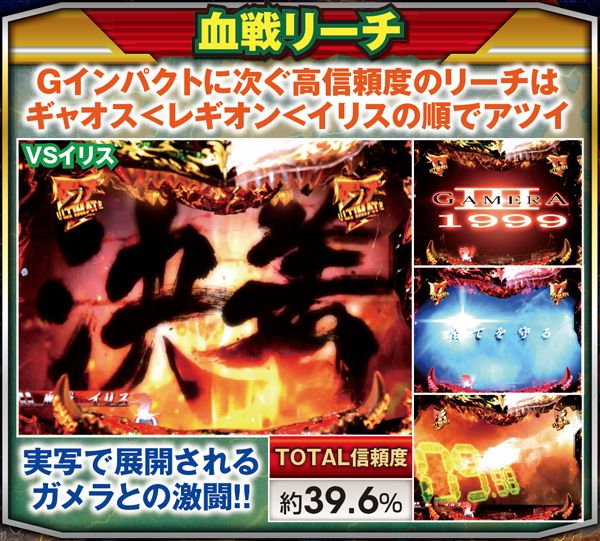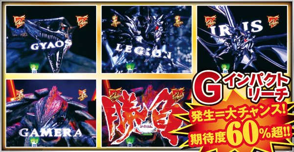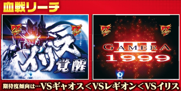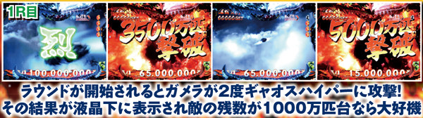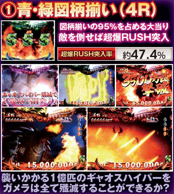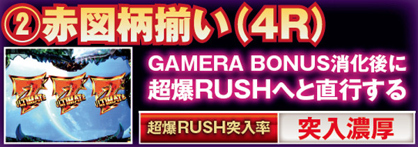 図柄揃い大当りは、赤図柄揃いなら超爆RUSH突入濃厚。青or緑図柄揃いの場合はラウンドバトルが開始され、ガメラが勝利すればRUSH獲得濃厚となる。