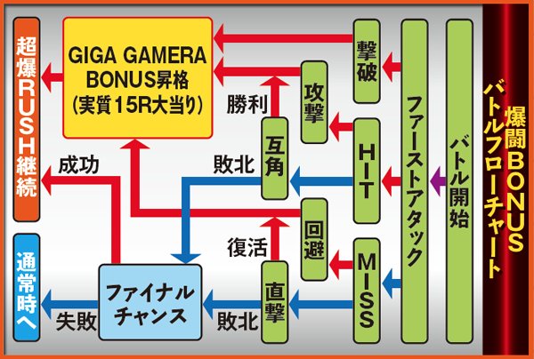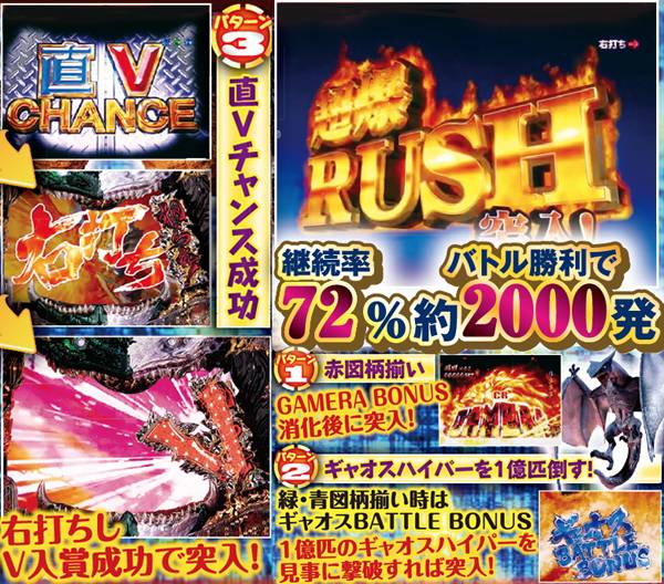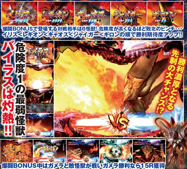 RUSH中にV入賞すると爆闘BONUSへ突入。ガメラと敵の攻防が繰り広げられ、最終的にガメラが勝てば実質15R獲得となる。敗北してもファイナルチャンスが成功すれば実質4R+RUSH継続。