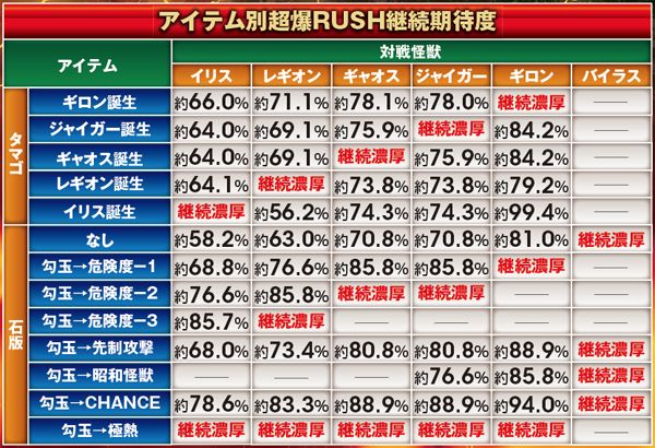 爆闘BONUS・アイテム別超爆RUSH継続期待度
