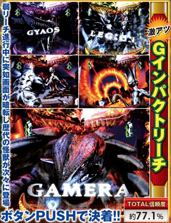 | 機種概要 | 特撮映画の金字塔「ガメラ」が1種+2種混合のパチンコ機として蘇った。一度「超爆RUSH」に突入すればライトミドルながら大当りの55%で約2000発の出玉を獲得でき、連チャン率も72%と高め。一撃大量出玉も十分狙えるスペックとなってるぞ。 |