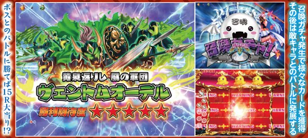 パチンコを打ちながらソーシャルゲームで遊べちゃう!? 新感覚のゲーム性が注目の1台。ガチャを引いてレアカードを集め大当りを目指そう。集めたカードのスキルが発動すれば大当りの大チャンスだ。 |