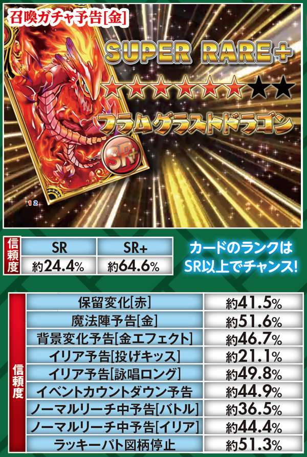 召還ガチャ予告はカードのレア度に注目。レア度がSR+なら信頼度は約64%と激アツだ。