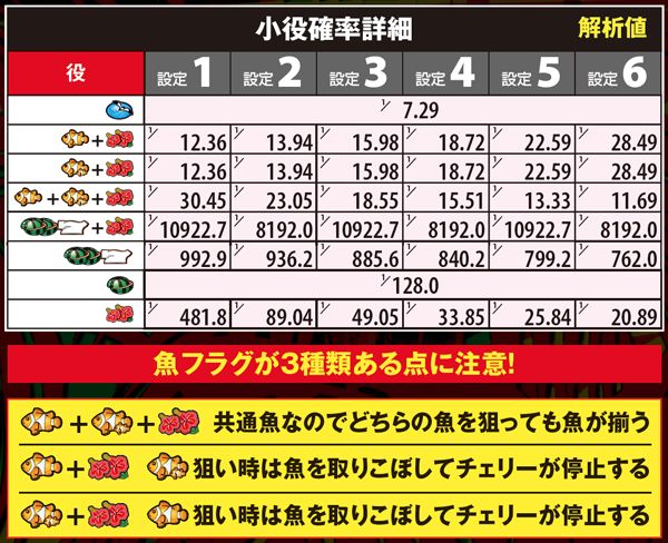 本機の魚フラグは3種類。どちらの魚を狙っても揃ういわゆる共通魚と、狙った魚を取りこぼしてしまうがその代わりにチェリーが揃うものが2種類ある。後者の魚は同時フォローできないので、どちらか一方の魚を狙った場合の出現率を目安としよう。また、単独チェリー確率に大きな設定差があるが、魚を取りこぼした際に揃うチェリーと区別できない。