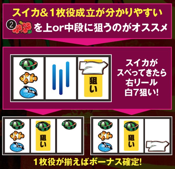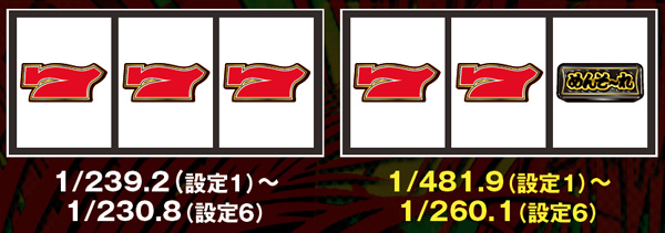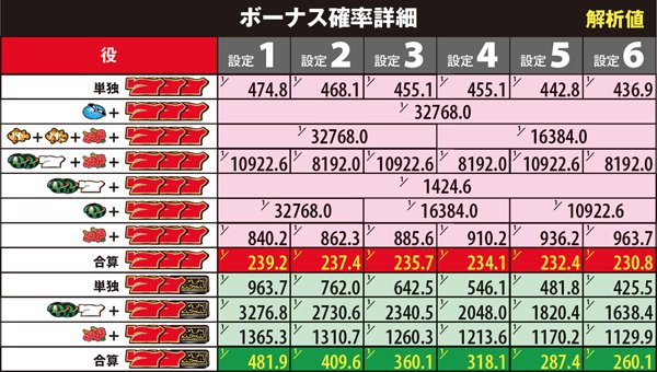スイカ重複ビッグなど設定差があるビッグがあるものの、合算確率にはそれほどの設定差はない。REGは設定1で481.9分の1、設定6だと260.1分の1と設定差がかなり大きいので推測の主軸と言える。立ち回る際は必ず注目しよう。