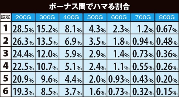 設定6のボーナス合算確率は約122分の1とかなり優秀なので、600Gハマる割合が1%以下。大ハマリが頻発している台はそれだけで低設定の可能性が高まってしまうので避けた方が良い。