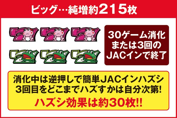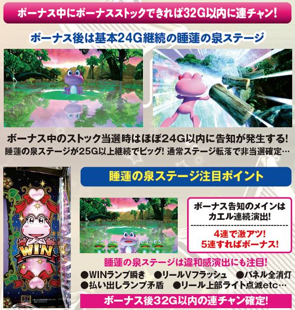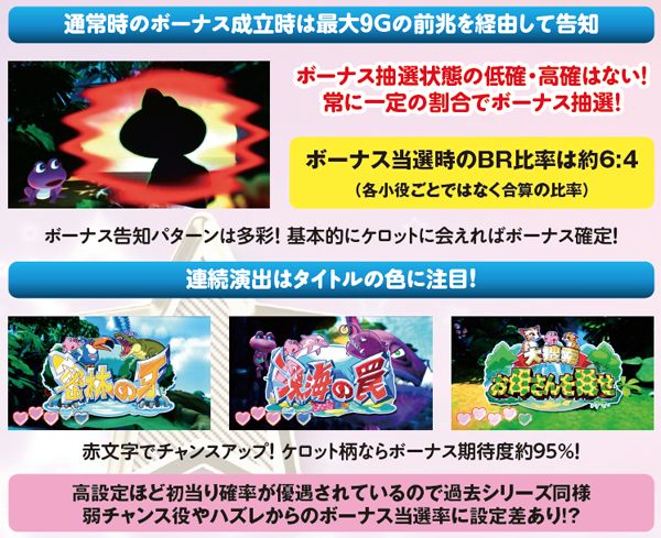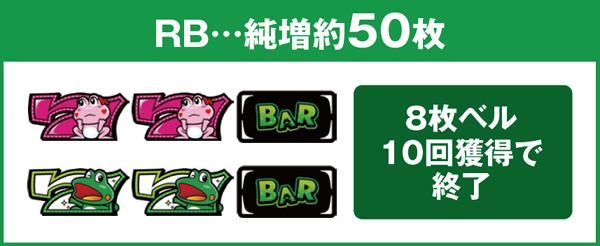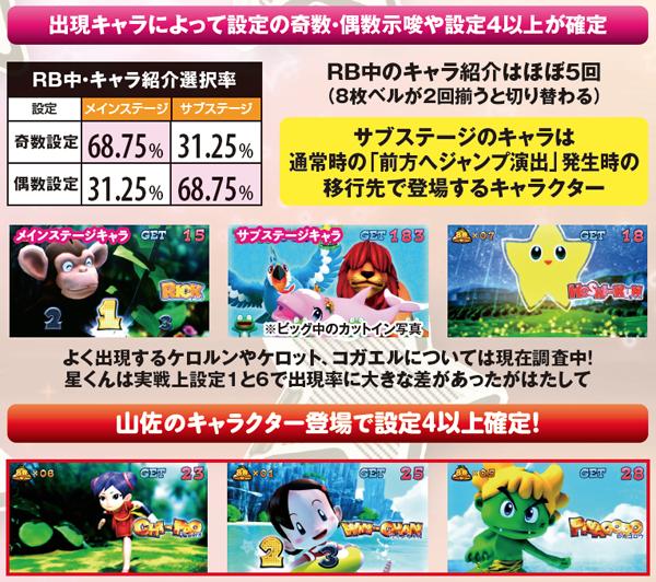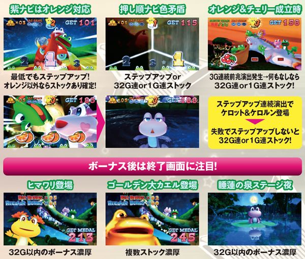 RB中はキャラ紹介に注目。ケロルンやケロット、コガエルの役割は不明だが、偶数示唆となるサブステージの3キャラは覚えておこう。設定4以上が確定する山佐キャラはビッグ中の1G連告知に比べて発生率が低そうだ。