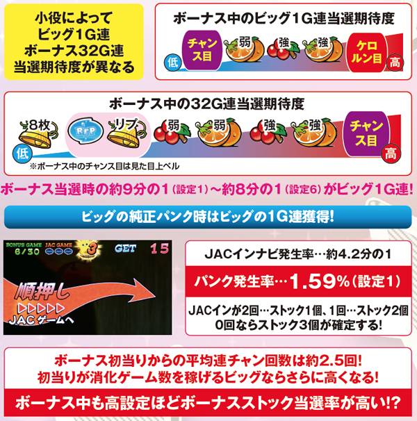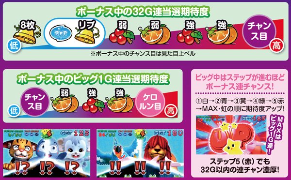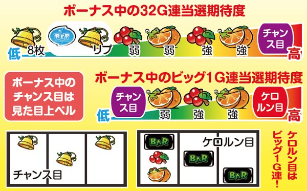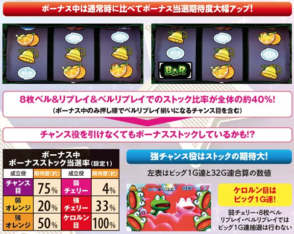 ボーナス中は通常時に比べてボーナス当選率が大幅アップするので、32G連&ビッグ1G連による激しい出玉性能を味わえる。ボーナス中も高設定ほどストックしやすい傾向にあるので、連チャンしやすい台は高設定の可能性が高まるが、ボーナス中は小役ごとにストック告知が発生するわけではないので、ケロルン目以外からの当選契機を見極めるのはなかなか困難である。