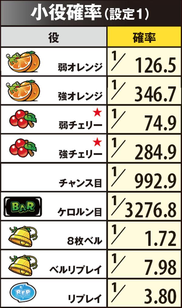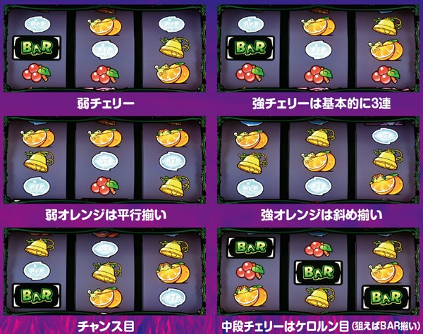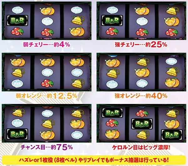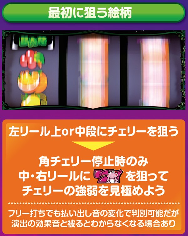 左リールにチェリーを狙い、角チェリー停止時のみ中・右リールに赤7を目押ししてチェリーの強弱を見極めよう。オレンジが枠内にスベってきても中・右リールで取りこぼさないのでフリー打ちでOK。ちなみに、弱&強チェリーの払い出しは2枚だが、中段チェリーが停止するケロルン目は8枚役である。