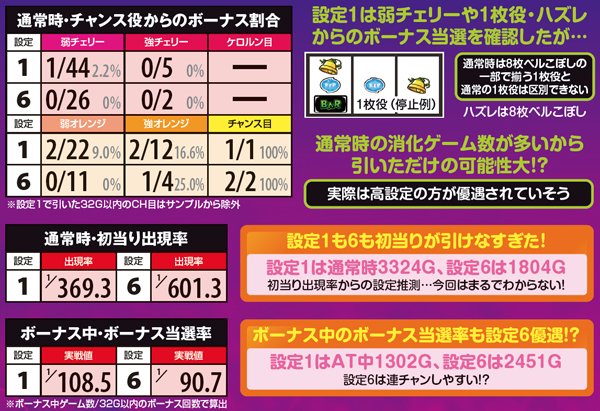 実戦結果から設定1と6の通常時を比べてみても、どちらも初当りがあまりに悪すぎて特筆すべき違いは分からなかった。ただし、AT中は設定6のボーナス当選率が設定1を凌駕したので、設定差を設けられている可能性あり。また、JACイン出現率は約4.2分の1なので、24G程度は粘っても良さそうである。