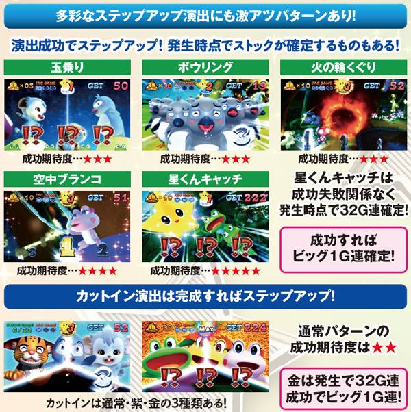ボーナス中は見逃しがちな演出に気を配れば、32G連or1G連のストックを察知できる場合がある。ちなみに、JAC中の残りナビが3回以上ある状況で弱&強オレンジ、強チェリーからステップアップの前兆が発生しなければ32G連or1G連ストック確定となるので、成立時は注目してみよう。