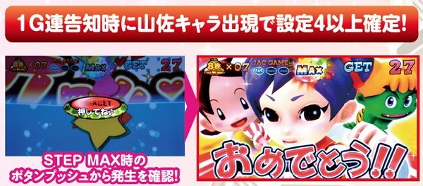 1G連告知時に山佐キャラが出現したら設定4以上確定となるので注目しよう。設定6実戦では1G連当選後、ケロルン目などでさらなる1G連ストックを獲得できた場合に何度も確認できたので、設定4以上であれば出現頻度はそれなりに高い可能性がある。
