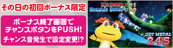 その日の初回ボーナス限定となるが、ボーナス終了画面でチャンスボタンを押して、チャンス音が鳴れば設定変更の可能性が高まる。鳴らないことも多く、鳴らないからといって据え置きは確定しない。