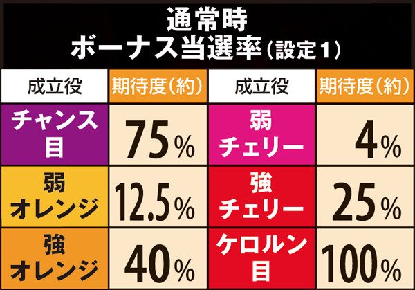 この上記の数値は設定1の当選率となるが、高設定ほど通常時のボーナス初当り確率が優遇されている。強チャンス役からのボーナス当選率は設定1と6の実戦結果から体感できるほどの差はなかった。過去シリーズ同様、弱チャンス役やハズレ(8枚ベル・1枚役)からのボーナス当選率に設定差がある可能性が高いので、注目しながら打ち進めよう。