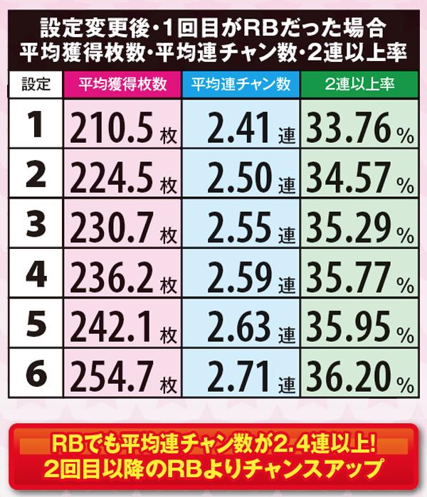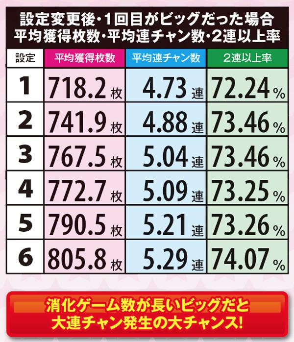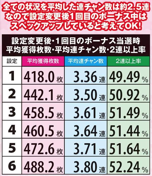 設定変更後1回目のボーナス中のみ、それ以降のボーナス中に比べてボーナスストック当選率が大幅にアップしているようで、平均連チャン数が設定1でも約1回多い。ただし、設定変更がわかりにくい台なので、全台リセットやリセット頻度が高いなど、クセを把握しているホールや状況を活用して立ち回りたい。